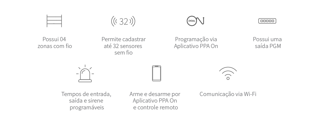 Alarme com alta conectividade, que se integra facilmente com o seu smartphone, permitindo ligar, desligar e receber notificações em qualquer lugar, a qualquer hora. Tudo isso, através do aplicativo PPA On.
