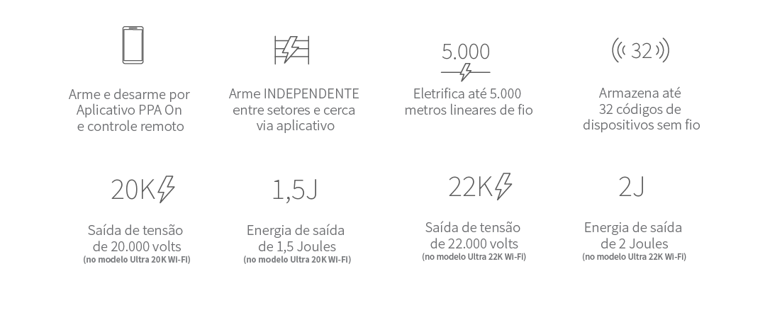 A linha Ultra é pura tecnologia e possui integração com o aplicativo PPA On, e desta forma é possível ter o controle total de sua cerca elétrica na palma da mão. Essa linha conta também com a tensão de saída de até 22 MIL VOLTS! É isso mesmo, inovação na medida e na potência que você precisa!